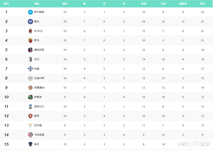 上赛季夺冠的那不勒斯本赛季依旧坚挺,不过他们目前仅仅领先1分并不保险,身后的追兵米兰双雄和罗马都只落后他们1分。
