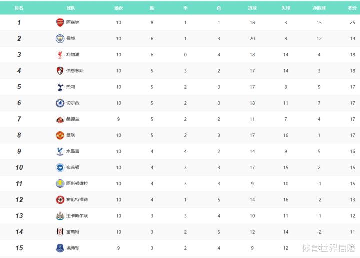 英超大多数球队已经完赛10场,目前阿森纳表现稳定且坚挺,领先第二名曼城6分独自领跑。