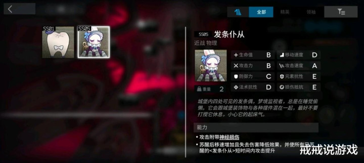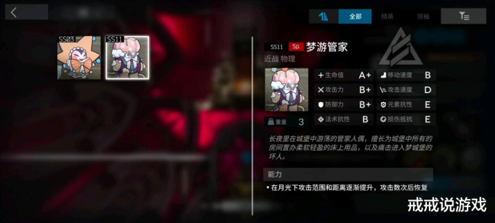 第二个也是重量级选手,梦游管家手长的同时伤害还高,被动叠满了两刀干碎银灰,还能打高台,祖宗也扛不住几下。别看攻击力只有B+,伤害真的很高。可以带个快活骗几刀没毛病的但还是太离谱了,要右边不站人或者不清,黍下去扛不住两刀。