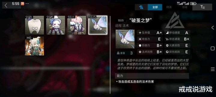 第一个要提名的是扑棱蛾子,俗称“破茧之梦”。A+血量B+双抗,法伤五连击还是在天上飞的,堪称真正意义上的重量级,肉得一B的同时打人巨痛,新时代炮火先兆者可以和乌萨斯飞天马桶、拉特兰监控鸟、大容量运输艇并列阴间飞机四大天王的水平,除了对次数有特化抗性的干员都不好扛。EW一炮没炸死的时候我就觉察到这个怪底子比较强,而且还是法术连击,界园dlc预备选手!