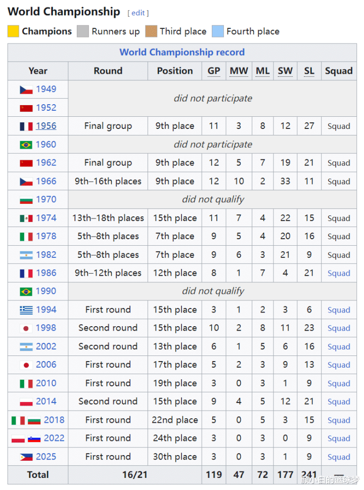 没错,中国男排在本次世锦赛中仅仅排在第30,也就是倒数第三,本次世锦赛中国的三个对手:巴西、塞尔维亚、捷克,最终中国队携手世界第二巴西一同出局,中国队只赢了一局比赛十分的惨烈。