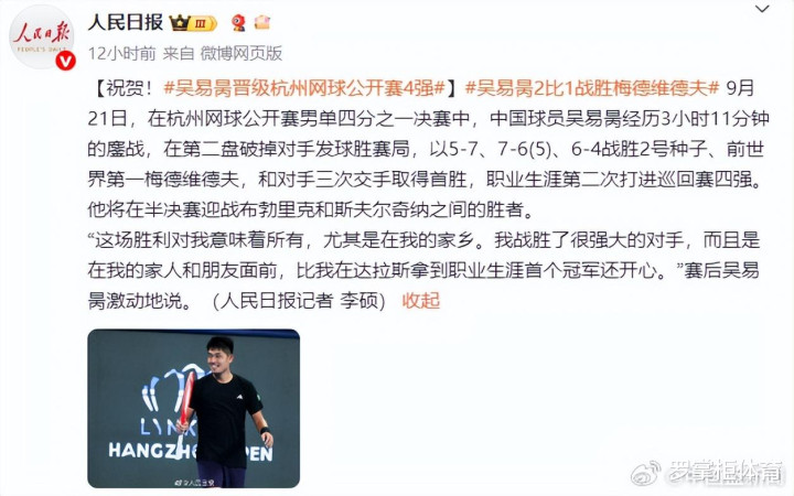 前中国男网“一哥”吴易昺再次成为球迷关注的焦点。在ATP250杭州网球公开赛男单1/4决赛中,吴易昺在挽救发球胜赛局后成功完成逆转,最终以大比分2-1击败前世界第一、大满贯冠军梅德韦杰夫,晋级四强。赛后,球迷纷纷向吴易昺表示祝贺。“激动得要哭了,恭喜阿昺,真的太拼了!”“杭州真是中国球员的福地啊!”“阿昺继续加油,夺冠不是没有可能!”并且,连人民日报也发文祝贺吴易昺晋级四强。