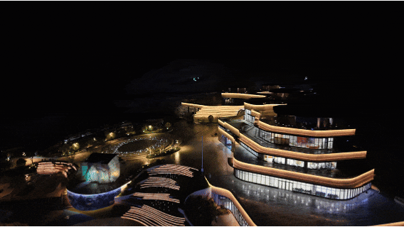 夜晚,不要错过精彩的灯光水幕秀,300米长的巨型水幕配合激光投影,呈现极具地域特色的山水意境和人文故事,为你的旅程画上完美的句号。