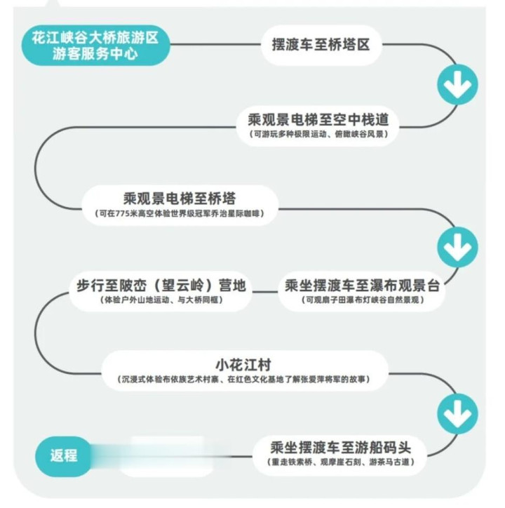 花江峡谷大桥旅游区游客服务中心→乘摆渡车至桥塔区→乘观景电梯至空中栈道(可游玩多种极限运动、俯瞰峡谷风景)→乘观景电梯至桥塔(可在775米高空体验世界级冠军乔治星际咖啡)→乘摆渡车至瀑布观景台(可观扇子田瀑布灯峡谷自然景观)→步行至陂峦(望云岭)营地(体验户外山地运动、与大桥同框)→小花江村(沉浸式体验布依族传统村寨、在红色文化基地了解张爱萍将军的故事)→乘摆渡车至游船码头(重走铁索桥、观摩崖石刻、游茶马古道)→入住特色民宿→返程