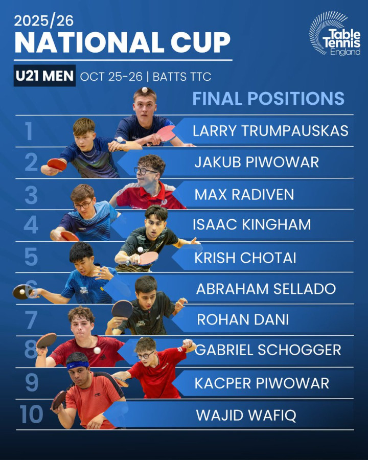 英格兰乒乓球协会报道,从WTT球星挑战赛伦敦站到哈洛的BATTS俱乐部,LarryTrumpauskas和EllaPashley成为U21国家杯的冠军。Trumpauskas以九战全胜的完美战绩横扫所有对手夺得男子组冠军,而Pashley在女子组比赛中仅输给AnnaGreen一场,最终捧起女子奖杯。完整赛事报告如下