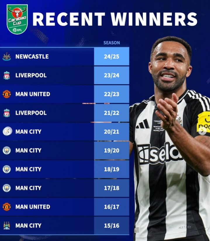直播吧10月29日讯《转会市场》统计了英格兰联赛杯近10年冠军,曼城共计赢得5次冠军堪称最大赢家。