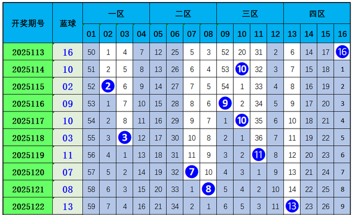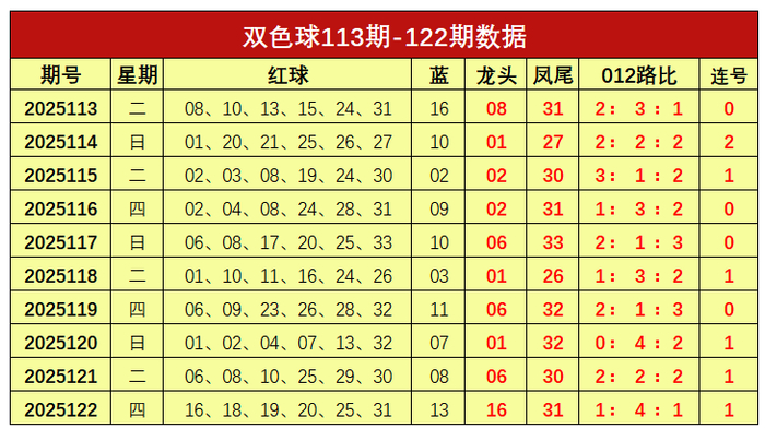 双色球第2025122开奖奖号:红球16、18、19、20、25、31,蓝球13。龙头16,凤尾31,012路比为1:4:1,开出1组连号。