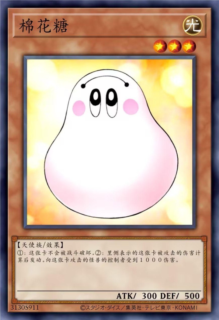 再就是棉花糖了,DM时期主角的王牌低阶怪兽之一,不但不会被破坏,而且里侧表示的这只怪兽被攻击之后,对方玩家还要受到1000点的伤害。