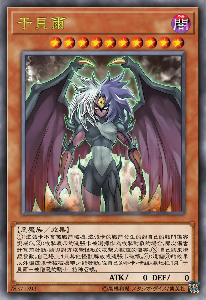 贝姐本尊的卡片于贝尔,不会被战斗破坏,因它造成的战斗伤害变成0,而攻击方要受到那只攻击怪兽攻击力数值的伤害。结束阶段,需要解放一只怪兽,或者破坏这只怪兽。但是要是破坏这只怪兽,更阴的怪兽就能登场了。