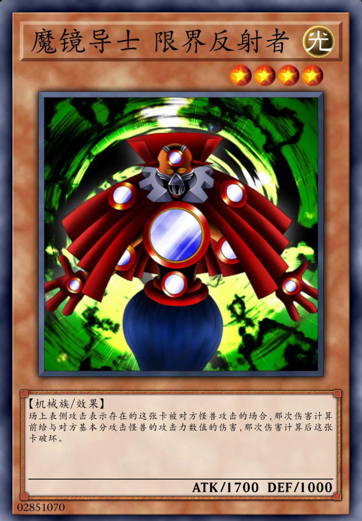 魔镜导士便是其中的代表怪兽,就用攻击表示好了,对方怪兽攻击力越高,在攻击这只怪兽之后,对方玩家就得受到那只攻击怪兽攻击力数值的伤害。而对1700点攻击力的魔镜导士造成伤害的怪兽,攻击力至少1800点,所以,对方要是攻击的话,对方受到的伤害反而比我们更高。